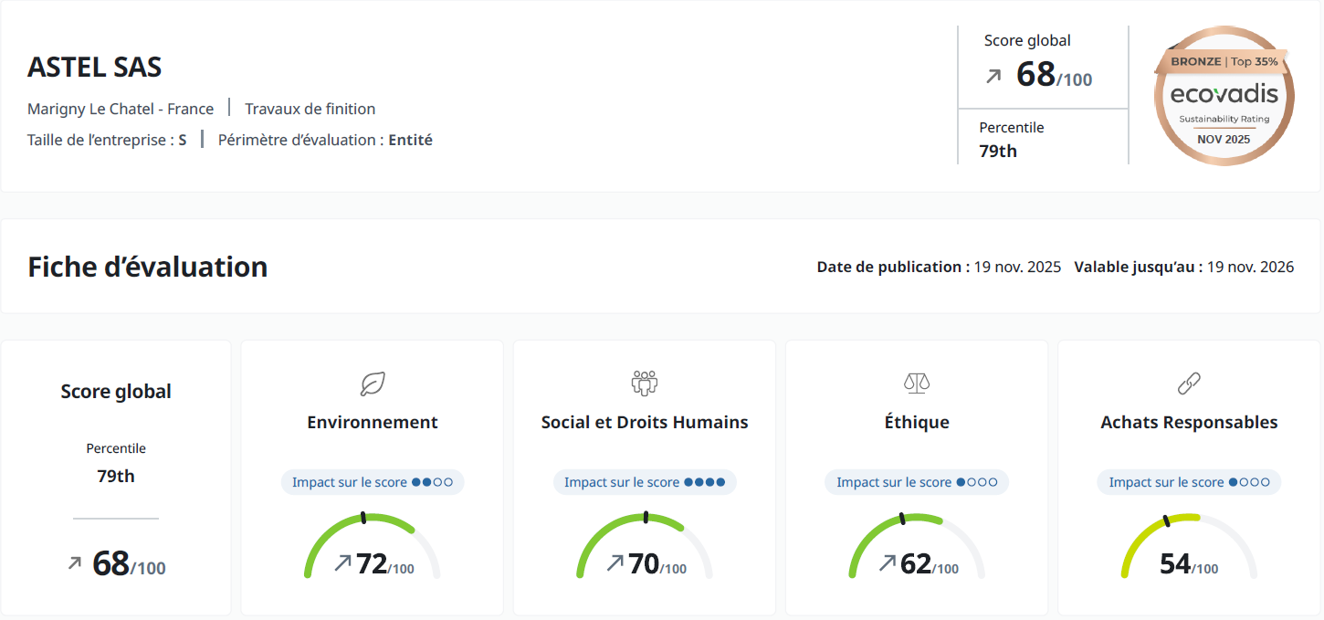 Afin de guider et de mesurer ses efforts dans le domaine de la RSE, Astel utilise le système d’évaluation Ecovadis.